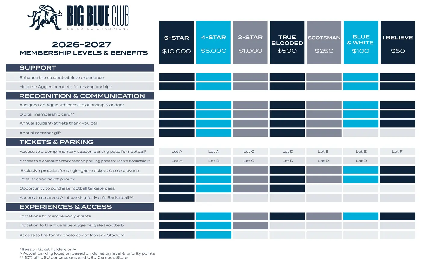 Aggie fans that support the Big Blue Club have access to perks like the best season ticket locations, complimentary parking, ticket priority for bowl games and NCAA tournaments, exclusive events, and more. Each Big Blue Club member has access to benefits made available to them based on their annual membership level - a combination of per-seat required donations and other philanthropic giving.